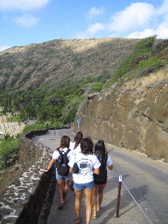 この坂をくだって下まで行かなかん。くだりはえーけど、帰りはつらいだらあ。