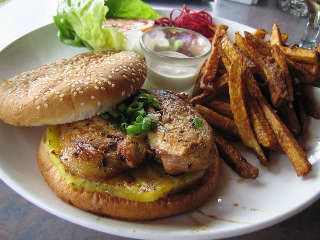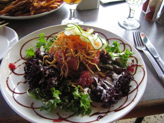 アヒポッキのサラダとチッキンのハンバーガーをマダムとシェア。