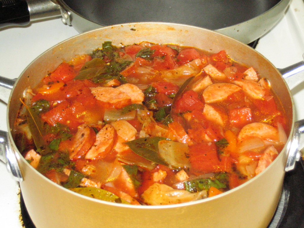 イタリアンシーズニング、ポーチギーソーセーヂを煮込んだだけのスープ。