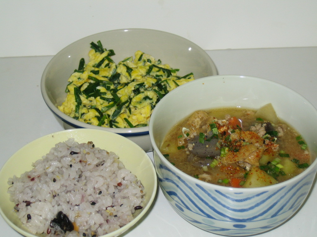 今夜のおかずは、トン汁とニラタマと16穀物米。